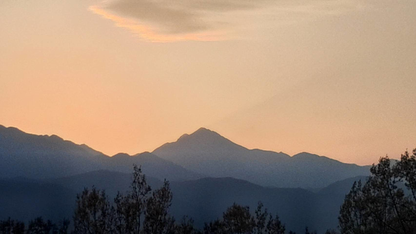 甲斐駒ヶ岳は山梨県と長野県の県境に位置し、日本アルプス屈指の名峰として峻険な山容が知られていますが、桑園から眺めるシルエットは独立峰に近く、夕方になると夕日をバックにしてその美しい姿が浮かび上がってきます。