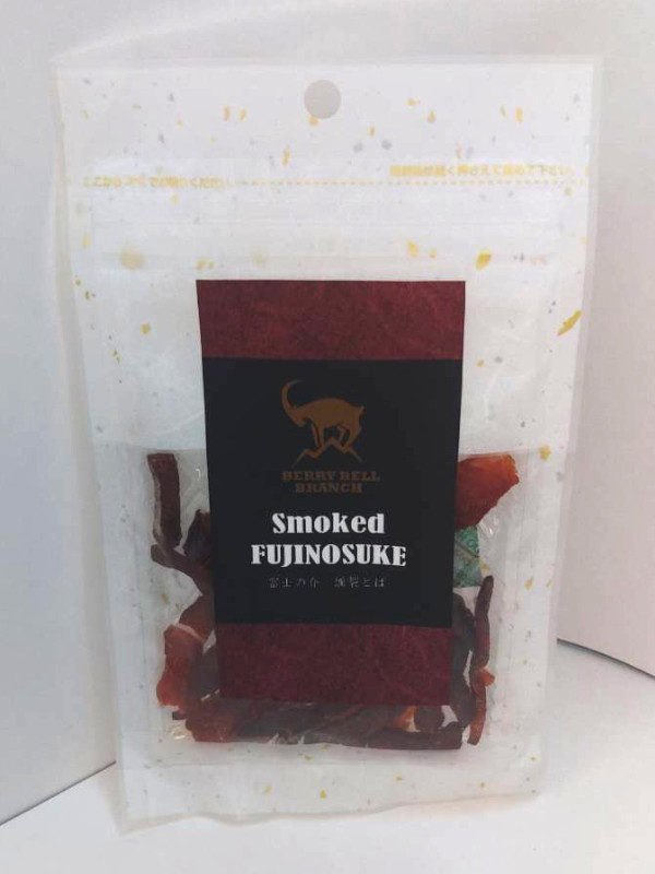 山梨県産の高級ブランド魚「フジノスケ」を使用した燻製トバです。フジノスケは、キングサーモンとニジマスの交配種で山梨県水産技術センターで誕生しました。